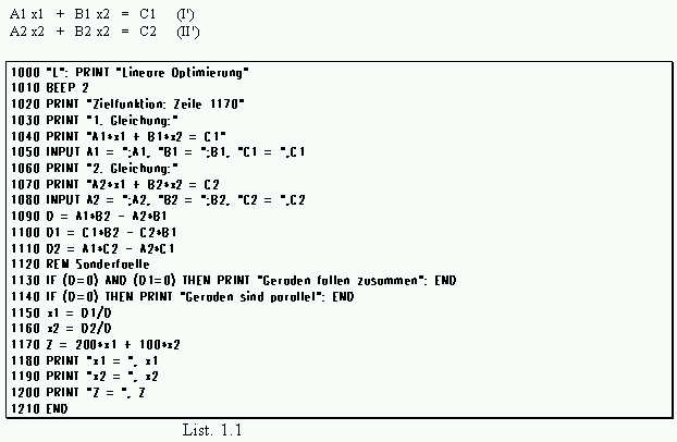 Das Basic-Programm (List. 1.1) ist für den Befehlssatz des programmierbaren Taschenrechners SHARP Pocket Computer PC-1403 entwickelt. Um bei der Programmierung die Verwendung von indizierten Variablen zu vermeiden und ein Variablenname aus maximal 2 Zeichen bestehen darf, wird das Gleichungssystem in der folgenden Form geschrieben: