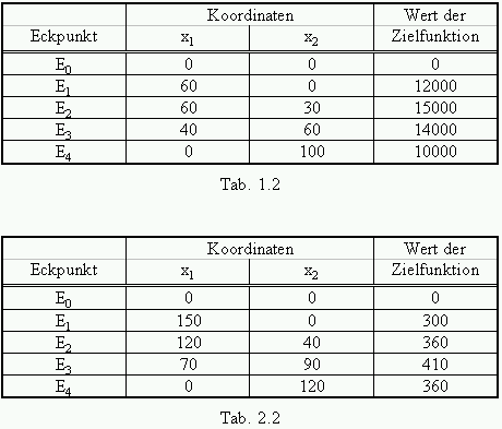 In den folgenden Tabellen (Tab 1.2 und Tab. 2.2) sind die berechneten Koordinaten der Eckpunkte und die zugehörigen Werte der Zielfunktion für Beispiel 1 und Beispiel 2 zusammengestellt.