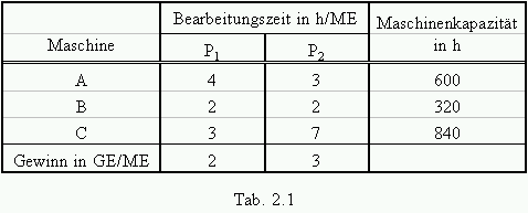 Ein Betrieb stellt zwei Produkte P1 und P2 her, die die drei Maschinentypen A, B,und C durchlaufen müssen. Die folgende Tabelle enthält die erforderlichen Bearbeitungszeiten pro Mengeneinheit (ME), die monatlich zur Verfügung stehenden Maschinenkapazitäten und den Gewinn pro Mengeneinheit (ME) in Gewinneinheiten (GE) für jedes Produkt: