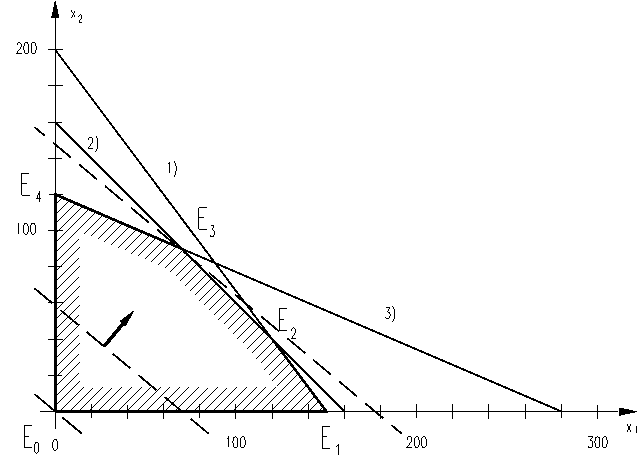Die Lösungsmenge X des Ungleichungssystems besteht aus allen geordneten Paaren (x1, x2), die die Ungleichungen (1.1), (1.2) und (1.3) und die Nichtnegativitätsbedingungen (1.4) erfüllen. Geometrisch bedeutet das die Durchschnittsmenge aller beteiligten Halbebenen. Dieser Durchschnitt ist der zulässige Bereich des Optimierungsproblems und wird als konvexes Polyeder bezeichnet. Die zulässige Menge X mit den Eckpunkten E0, E1, E2, E3, E4 ist in Abb. 1.1 schraffiert dargestellt.
