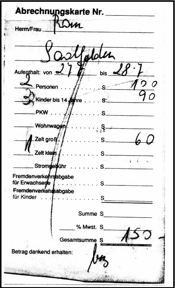 2 Personen S 100 3 Kinder S 90 1 Zelt S 60Gesamtsumme S 150