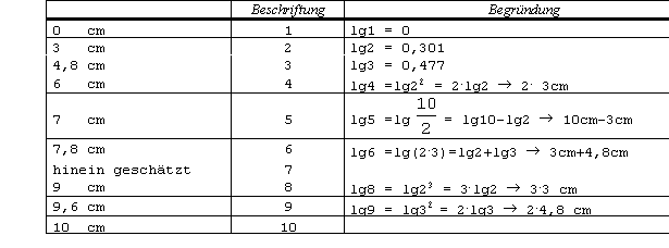 Eine Dekade sei mit 10 cm gegeben. Dann kann mit der Kenntnis von2 Logarithmenwerten