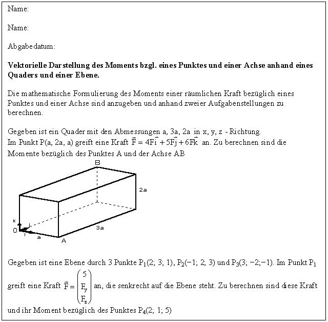 Die mathematische Formulierung des Moments einer räumlichen Kraft bezüglich eines Punktes und einer Achse wird anhand zweier Beispiele gegeben und das Moment berechnet.