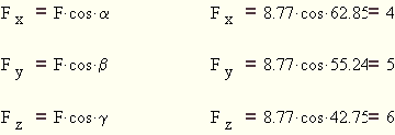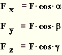 Eine an einem starren Körper z.B. im Punkt A - gegeben durch den Ortsvektor r=(x,y,z) - angreifende Kraft F wird den Körper nicht nur verschieben, sondern in Bezug auf das räumliche Koordinatensystem auch verdrehen, d.h. in Rotation versetzen. Die Kraftkomponenten Fx, Fy, Fz die den Körper in die Koordinatenrichtung x, y und z verschieben, erhalten wir wieder durch Multiplikation der Kraft mit dem Kosinus ihrer Richtungswinkel.