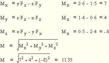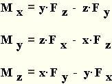 Da die Kraft F nicht im Koordinatenursprung angreift bzw. ihre Wirkungslinie nicht durch den Ursprung des Koordinatensystems geht, erzeugen die Kraftkomponenten ein Moment, das den Körper um die jeweilige Koordinatenachse zu verdrehen versucht. Wie in der ebenen Statik ist das Moment positiv, wenn der Momentenvektor in die positive Koordinatenrichtung zeigt. Daraus folgt für die Komponenten des Momentenvektors: