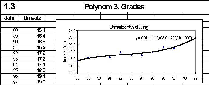 Die Gegenüberstellung der Darstellungen 1.2(linear) und 1.3 (polynom 3. Grades) läßt erkennen, wie unterschiedlich die schwankenden Umsätze als "funktional" bedingt oder als "zufällige Streuungen" um die Regressionslinie interpretiert werden. Die Prognose für 98 oder gar 99 läßt den Unterschied im Ergebnis deutlich werden.