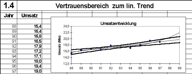 Die Frage nach dem "richtigen" Ergebnis führt zunächst zur Warnung, aus wenigen Daten viele Parameter errechnen zu wollen, dann zur Überlegung, daß es sich um Schätzwerte mit beschränkter Genauigkeit und Sicherheit handelt. In Darstellung 1.4 ist dem linearen Trend der Vertrauensbereich (Irrtumswahrscheinlichkeit 5%) hinzugefügt.