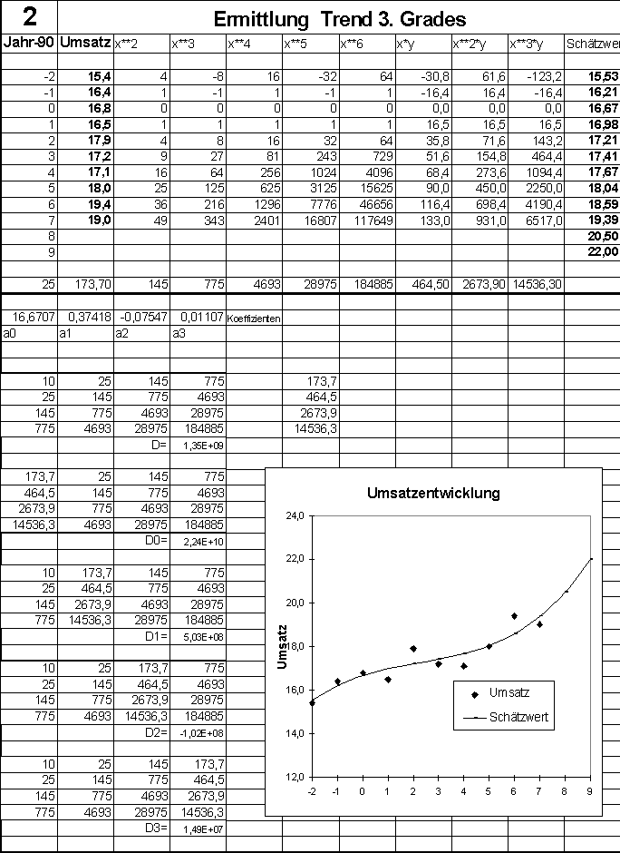 In Darstellung 2 sind jene Zwischenwerte mit eingeblendet, die erforderlich sind, wenn ohne Benutzung von programmierten Funktionen der Trend dritten Grades ermittelt wird. Tabelle 2 enthält die um die erforderlichen Potenzen der Funktionswerte erweiterte Tabelle samt Summen, die die Koeffizienten für die "Normalgleichungen" bilden. Die Determinanten der dargestellten Matrizen dienen der Lösung des Gleichungssystems zur Berechnung der Trendfunktion