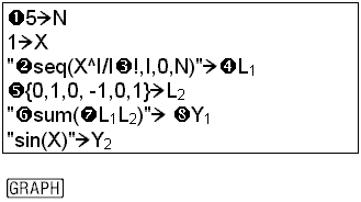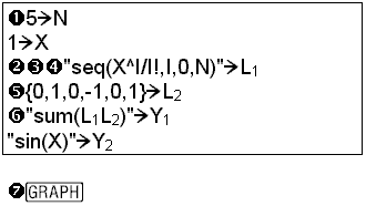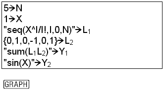 Bei einer Zuweisung seq(X^I/I!,I,0,N)! L1 (ohne Anführungszeichen) wird eine Liste erzeugt, in der die gerade aktuellen Werte von X und N verarbeitet werden.