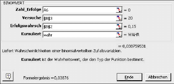Um die Tabelle zu vervollständigen, wird in der Zelle B6 die Funktion "BINOMVERT" mit Hilfe des Funktionsassistenten aufgerufen und das Dialogfenster vervollständigt.