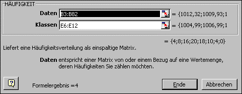 a) Mit der Matrix-Funktion HÄUFIGKEIT kann eine Klasseneinteilung erstellt werden. Dazu benötigen wir eine Spalte mit den Klassenobergrenzen (Bereich E6:E12). Nun markieren Sie den Bereich für die absoluten Häufigkeiten G6:G12. Rufen Sie nun über den Funktionsassistenten die Funktion HÄUFIGKEIT auf und geben Sie die Bereiche für die Daten und die Klassenobergrenzen ein: