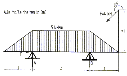 Gegeben ist der abgebildete Träger, welcher auf einem Fest- und einem Loslager aufliegt. Er wird mit einer schiefen Kraft, zwei Dreieckslasten und einer Rechteckslast beansprucht.