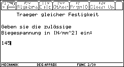 Anschließend muß noch die zulässige Biegespannung, die Gesamtlänge des Trägers und wiederum der Abstand, in welchem die Höhe berechnet werden soll, eingegeben werden: |