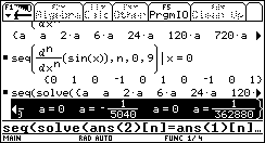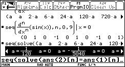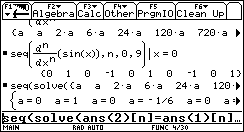 Wir geben zunächst die rechte Seite bis zur 9.Potenz ein. Für die Ermittlung der Koeffizienten ai schreibt man sie zunächst als Konstanten a an. Danach bildet man die ersten 9 Ableitungen mit Hilfe des Sequence-Befehles und setzen x = 0, wobei für n = 0 der Funktionswert an der Stelle x = 0 ermittelt wird. |