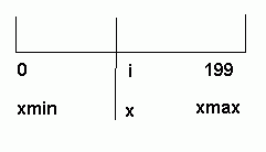 x - xmin = (xmax - xmin)/(199 - 0) * (i - 0) bzw. i - 0 = (199 - 0)/(xmax