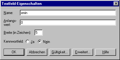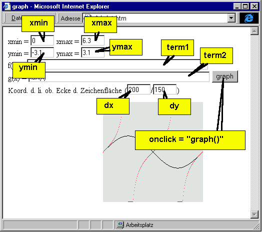 var xmin = document.parameter.xmin.value*1 var xmax = document.parameter.xmax.value*1 var ymin = document.parameter.ymin.value*1 var ymax = document.parameter.ymax.value*1 var term1 = document.parameter.term1.value var term2 = document.parameter.term2.value var dx = document.parameter.dx.value*1 var dy = document.parameter.dy.value*1// Die Koeffizienten für die Umrechnung zwischen Benutzer- und Fensterkoordinaten werden berechnet