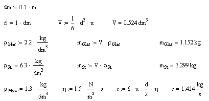 Interessant ist nun der Vergleich des Geschwindigkeits - Zeit Verlaufs zweier Kugel (r1 und r2) mit gleichem Durchmesser d, welche in einem zähen Medium (rFl) sinken, auf graphischem Weg. Die Konstante c ergibt sich nach dem Stokes´schen Gesetz zu c = 6×p×h×r (Die Bestimmung der Konstanten c ist im Anhang angeführt).