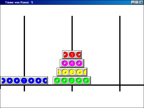 Bei n = 5 Scheiben sind das 31 Züge, bei n = 10 Scheiben 1023