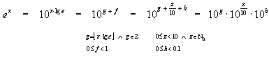 Man zerlegt den Zehnerexponenten x× lg e in einen ganzzahligen Teil g und einen (positiven) Bruchanteil f, der wiederum in die Zehntel (0.z) und den Rest (h < 0.1) aufgespalten wird. Auf einer "Dezimalmaschine" benötigt man hiezu keine zählende Rechenoperation!