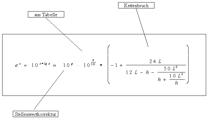 Bevor nun der vollständige Algorithmus dargelegt werden kann, muß noch die Anpassung an den Tachenrechner erfolgen. Taschenrechner benützen intern dezimale Gleitkomma-Arithmetik, es ist daher zweckmäßig, ex über 10x× lg e als Zehnerpotenz zu berechnen.