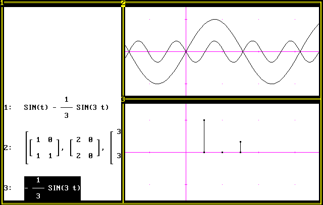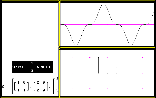 Aus dem Amplitudenspektrum soll der Schüler nun erkennen , daß die Funktion im Grafikfenster 2 durch zwei Sinusfunktionen mit den entsprechenden Amplituden und Frequenzen dargestellt werden kann . Weiters soll man darauf hinweisen , daß nur die Absolutbeträge der Amplituden von Bedeutung sind.