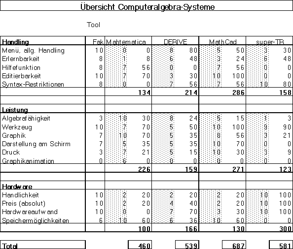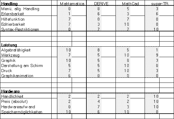 Das Programm MathCad weist im Bereich Verständnishilfe (Tutor) ebenfalls die höchste Punkteanzahl auf, was doch etwas überrascht. Bei etwa gleichmäßig gut verteilter Eignung in allen Bereichen hat die exzellente Bildschirmdarstellung des Arbeitsblattes letztlich doch für ein klares Übergewicht des Programmes gesorgt.
