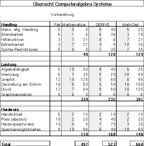 Die Wertungen der Faktoren unterliegen natürlich deutlich einer subjektiven Färbung, spiegeln sie doch wider, welche Bedeutung die einzelne Person jedem einzelnen Punkt in Hinblick auf den beabsichtigten Einsatz zumißt. Hier sollen Sie bitte ihre eigenen Werte eintragen, sind doch dafür keine Kenntnisse der Software notwendig. So kann diese Arbeit für Sie zu einer individuellen Entscheidungshilfe werden. Sie finden die vorbereitete Tabelle auf der Diskette dieser Aussendung unter dem Namen AFRHIMMU.XLS (Format Excel 4).