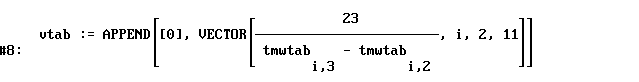 Erläuterung: Da sich die Formel (3) auf die erste Zeile der Datenmatrix tmwtab nicht anwenden läßt (Division durch Null) muß die Anfangsgeschwindigkeit v0 = 0 getrennt festgelegt werden. Mit APPEND wird dieser Wert dann den restlichen errechenbaren Geschwindigkeitswerten vorangestellt.