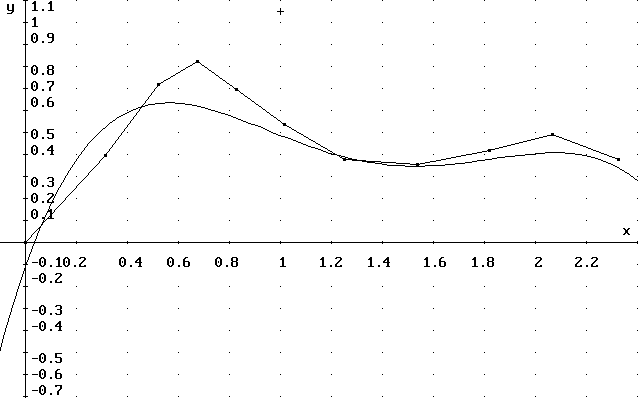 Mit der DERIVE-Funktion FIT wird aus der in #9 erzeugten Matrix eine Polynomfunktion stf erzeugt. Diese Ausgleichsfunktion minimiert die Summe der Quadrate der Abweichungen zu den Meßpunkten.