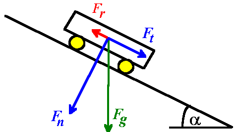 Fg = mž g m = 0,2 kg ... Masse des Waggons g = 9,81 m/s2 ... Erdbeschleunigung Tangentialkraft: Ft = Fgž sin a Reibngskraft: Fr = m ž Fn = m ž Fgž cos a m ... Reibungskoeffizient