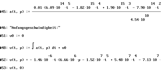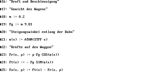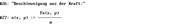 Dividiert man Fa durch die Masse m, so erhält man die Beschleunigung des Waggons in Abhängigkeit der Stelle x. Weiters wurde auch µ als unabhängige Variable in die Funktion hineingenommen, um den Einfluß der Reibung leicht untersuchen zu können.