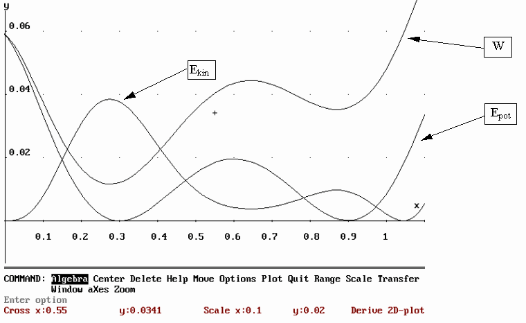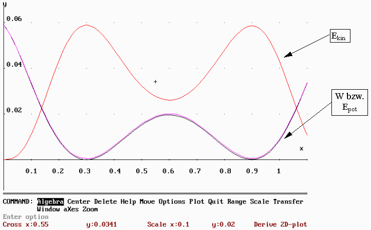 Die Graphen für die potentielle Energie und die verrichtete Arbeit (Epot 0 – W(x1,0)) stimmen fast überein. Die zur Verfügung stehende Energie wird zur Gänze umgesetzt. Die Summe der kinetischen Energie und der Arbeit ist nahezu konstant. (Im ersten Drittel der Funktion macht sich der Fehler, der bei den Vereinfachungen gemacht wurde, bemerkbar!)