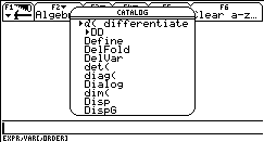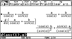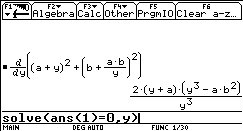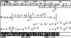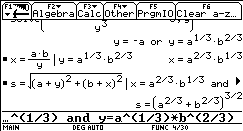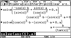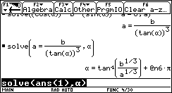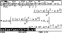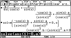 solve( Gleichung,Variable),der direkt über die Tastatur oder wiederum aus dem CATALOG in die Eingabezeile eingefügt werden kann. Mit dem Befehl ans(1) wird auf die letzte Ausgabe zugegriffen.