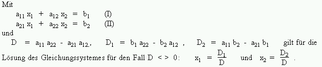 Für den Fall D = 0 ist noch zu unterscheiden, ob D1 (D2) von Null verschieden ist. Geometrisch bedeutet D = 0 und D1 <> 0, daß die durch (I) und (II) beschriebenen Geraden parallel, aber verschieden sind. D = 0 und D1 = 0 bedeutet, daß die Geraden zusammenfallen.