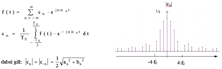 erhält man schließlich die komplexe Fourierreihe (im Amplitudenspektrum eine Darstellung nach "positiven" und "negativen" Frequenzen)