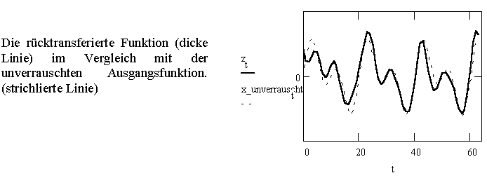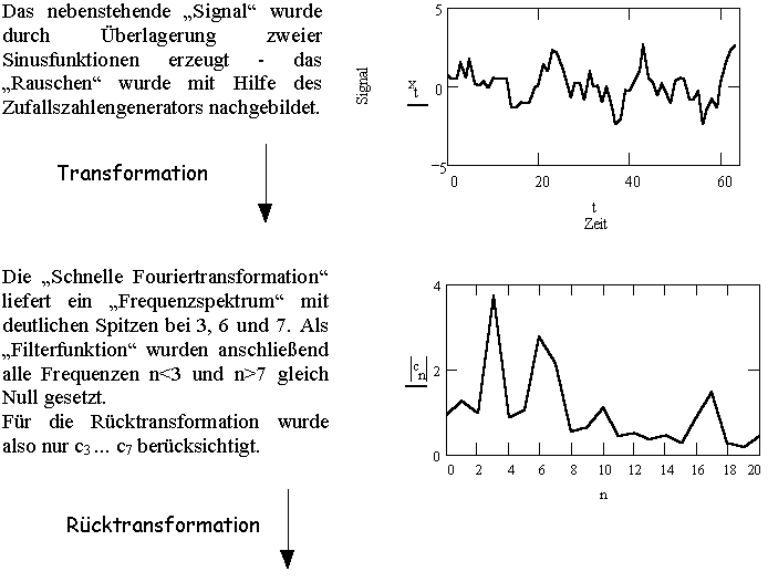 Das folgende Beispiel zeigt das Prinzip, wie ein verrauschtes Signal mit Hilfe der Fouriertransformation (zumindest teilweise) entrauscht (entstört) werden kann. Es wurde mit MATHCAD gelöst (siehe File RO_FFT.MCD auf der Diskette)