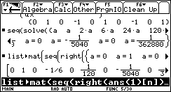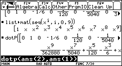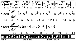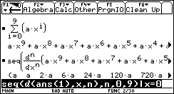 Wir geben zunächst die rechte Seite bis zur 9.Potenz ein. Für die Ermittlung der Koeffizienten ai schreibt man sie zunächst als Konstanten a an. Danach bildet man die ersten 9 Ableitungen mit Hilfe des Sequence-Befehles und setzen x = 0, wobei für n = 0 der Funktionswert an der Stelle x = 0 ermittelt wird. |