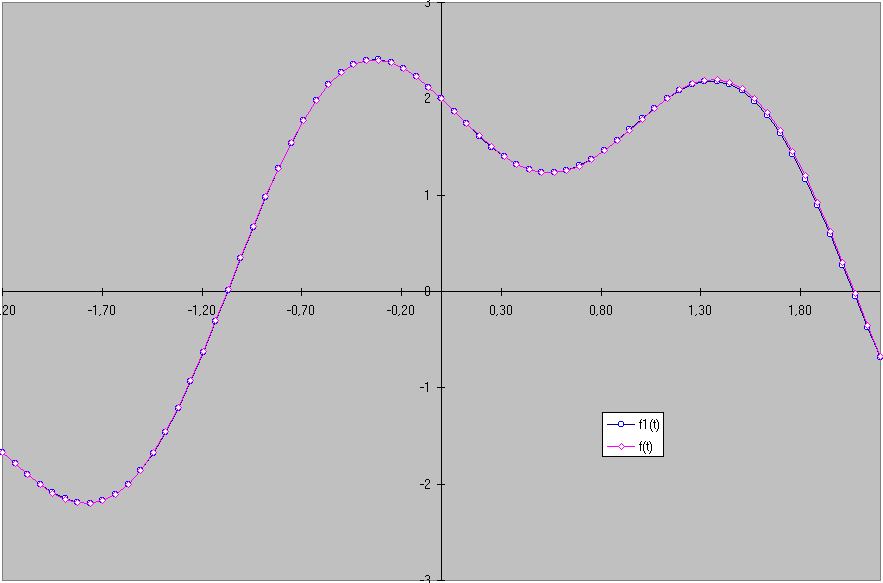 Mit EXCEL wird diese Funktion f1(t) mit der zu approximierenden Funktion f(t) verglichen. Die Übereinstimmung der beiden Graphen ist so gut, daß man geradezu von einem positiven mathematischen Erlebnis für die Schüler sprechen kann, besonders dann, wenn ihnen die Gleichung der Funktion, von der ausgegangen wurde, nicht bekannt ist.