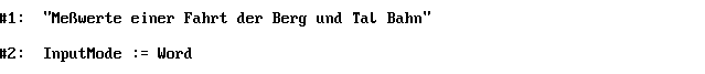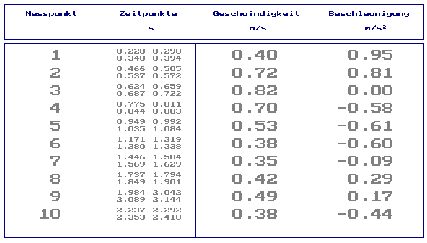 Nach dem Laden dieser Datei kann man nun im Hauptmenü mit [F3] eine Tabelle der Meßwerte (Zeitpunkte) und der berechneten Geschwindigkeiten und Beschleunigungen im entsprechenden Meßpunkt auf dem Bildschirm anzeigen.