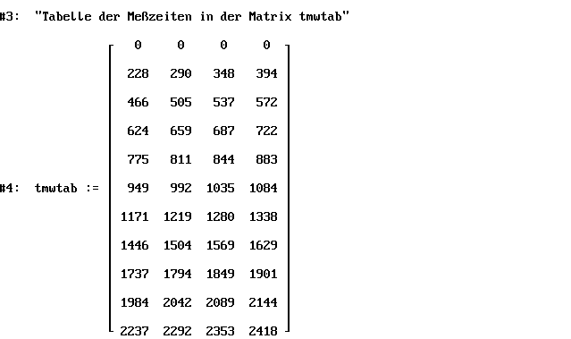 Die Datenmatrix tmwtab (ZeitpunktMeßWert-Tabelle) enthält in der (k+1)-ten Zeile die Meßergebnisse für den Kontakt Nr. k, wobei k = 0 dem Startpunkt entspricht. In der i-ten Spalte steht der entsprechende Wert des Zeitpunkts tki in ms. (vergleiche [5] Beitrag 6 - Seite 2)