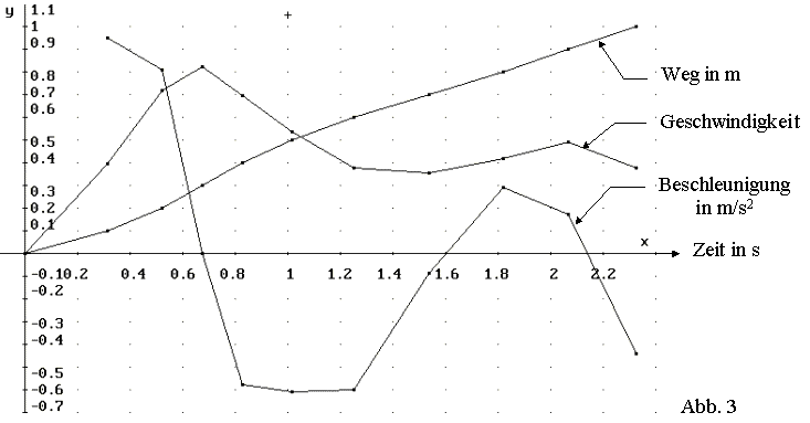 Mit der Taste [F4] kann man vom Hauptmenü aus eine grafische Darstellung des Weg-Zeit-, Geschwindigkeit-Zeit- und Beschleunigung-Zeit-Diagramms auf dem Bildschirm anzeigen. (Abb. 2)