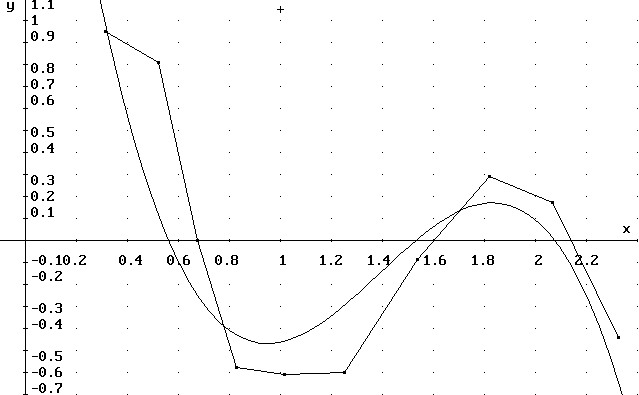 Mit der DERIVE-Funktion FIT wird aus der in #9 erzeugten Matrix eine Polynomfunktion stf erzeugt. Diese Ausgleichsfunktion minimiert die Summe der Quadrate der Abweichungen zu den Meßpunkten.
