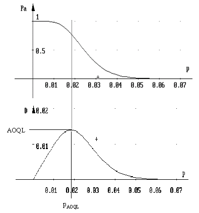 Nebenstehende Abbildung zeigt in der Gegenüberstellung die OC und Durchschlupfkurve der n-c-Anweisung 315-7 Bei Berechnung mit Hilfe der Poissonverteilung erhält man : pAOQL = 1,84 %