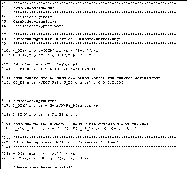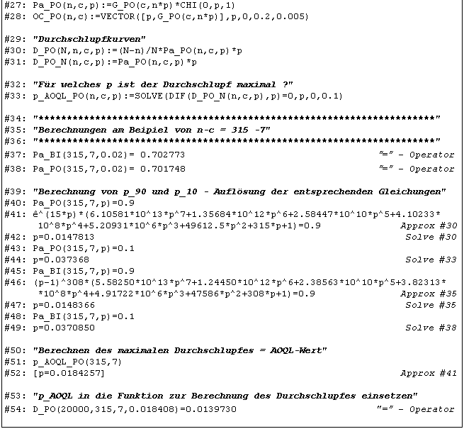 Die hier vorgeführten Berechungen und Funktionsdarstellungen lassen sich relativ leicht auf andere Stichprobensysteme ausweiten (Doppelstichprobensysteme, Mehrfachstichprobenpläne, messende Prüfung). Für den Mathematikunterricht scheint mir aber die hier gezeigte Besprechung der qualitativen Einfachstichprobenanwesiungen (n-c) ausreichend zu sein.