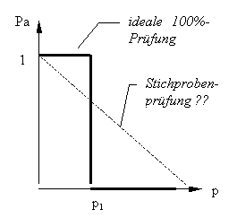 Bei der 100%-Prüfung gibt es einen vereinbarten Schlechtanteil p1, bis zu dem die Lieferung mit Wahrscheinlichkeit 1 angenommen wird. (p1 wäre im Beispiel aus dem 1.Abschnitt 1%) Die strichlierte Linie stellt eine mögliche Vermutung für den Verlauf der Operationscharakteristik einer Stichprobenanweisung (etwa 315-7) dar, die allerdings nicht dem tatsächlichen Ergebnis entspricht. |