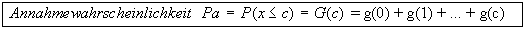 Das Los wird angenommen, wenn höchstens c fehlerhafte Einheiten (bzw. Fehler/Einheit) gefunden wurden. Unabhängig von der verwendeten Verteilung gilt daher: