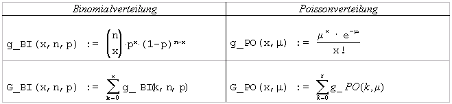 Prinzipiell liegt hier eine Situation vor, auf die das Modell der Hypergeometrischen Verteilung zutreffen würde. Im vorliegenden Beispiel und in den meisten Fällen der Praxis ist jedoch die Losgröße N recht groß im Vergleich zu n, sodaß die Näherung durch die Binomialverteilung möglich und sinnvoll ist. Recht häufig wird (gerade im Bereich der Stichprobensysteme) die Näherung durch die Poissonverteilung (Parameter m = n× p ) verwendet, die ja typischerweise für kleines p und relativ großes n Anwendung findet. Außerdem findet die Poissonverteilung bekanntlich dann Verwendung, wenn nicht fehlerhafte Einheiten (® Binomialverteilung) sondern Fehler pro Einheit gezählt werden (z.B. Lackfehler je m2, Isolationsfehler je km Draht, ...).